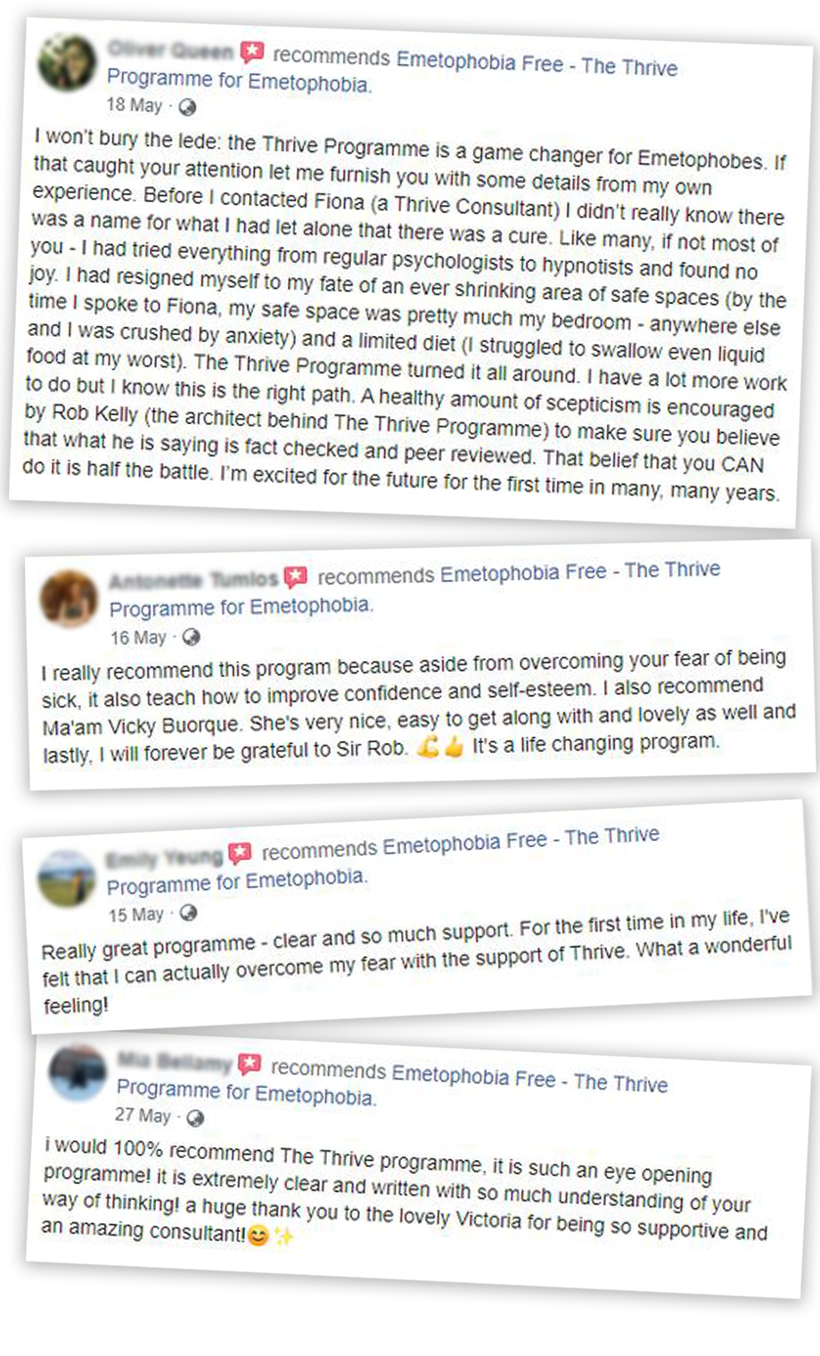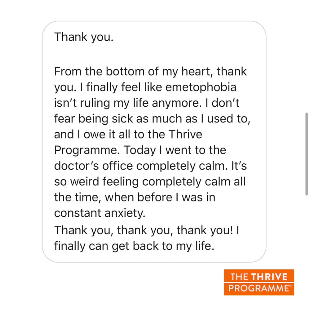 Many of our success stories have not only managed to overcome their fear but also related problems that were holding them back from living the life they deserve: from OCD to panic attacks to eating issues. That's why we have 'thrive' in the name: the program will improve your mental health and change how you view the world, so you can become strong, confident and thriving!